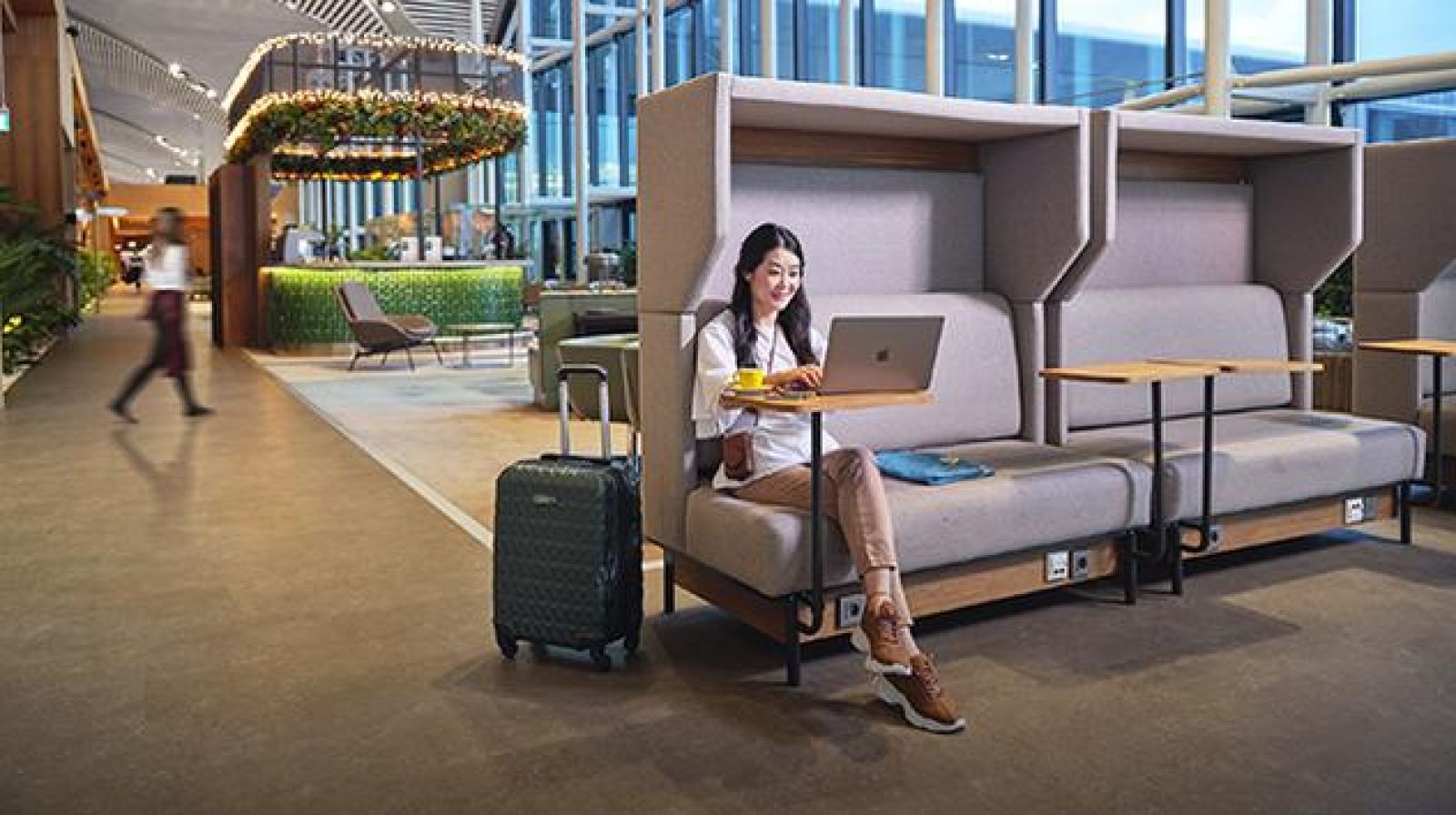 Relax in a peaceful and comfortable environment, away from the busy terminal atmosphere. A quiet and stylish atmosphere greets you after the security controls. It offers the perfect setting to rest, work, or enjoy snacks before your journey.